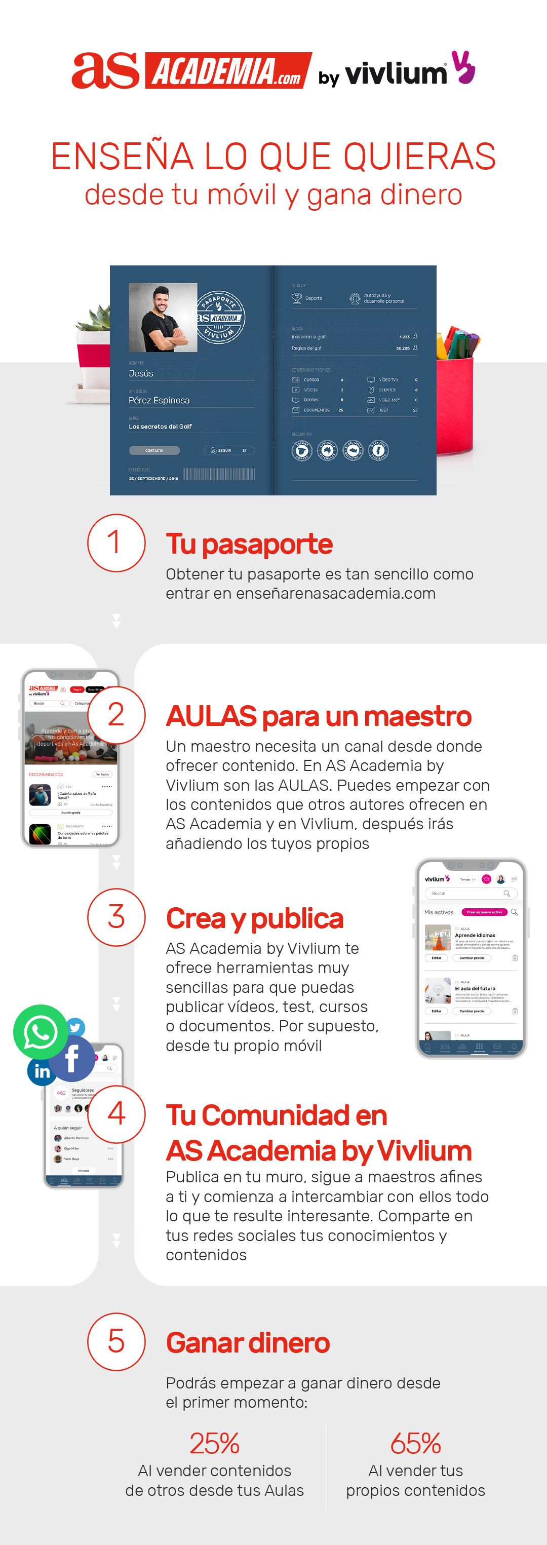 Uno de los objetivos de Vivlium es devolver la dignidad al autor que enseña en esta nueva era digital. Es por ello que eres libre de elegir el precio que consideres. Además, te llevas el 65% de este (descontando impuestos de cada país y comisiones TPV/PayPal). Y en Vivlium sabemos que compartir siempre lleva más lejos. Por eso, si incluyes activos de otros creadores, te llevas el 25% del precio que ellos fijen (descontando impuestos de cada país y comisiones TPV/PayPal).